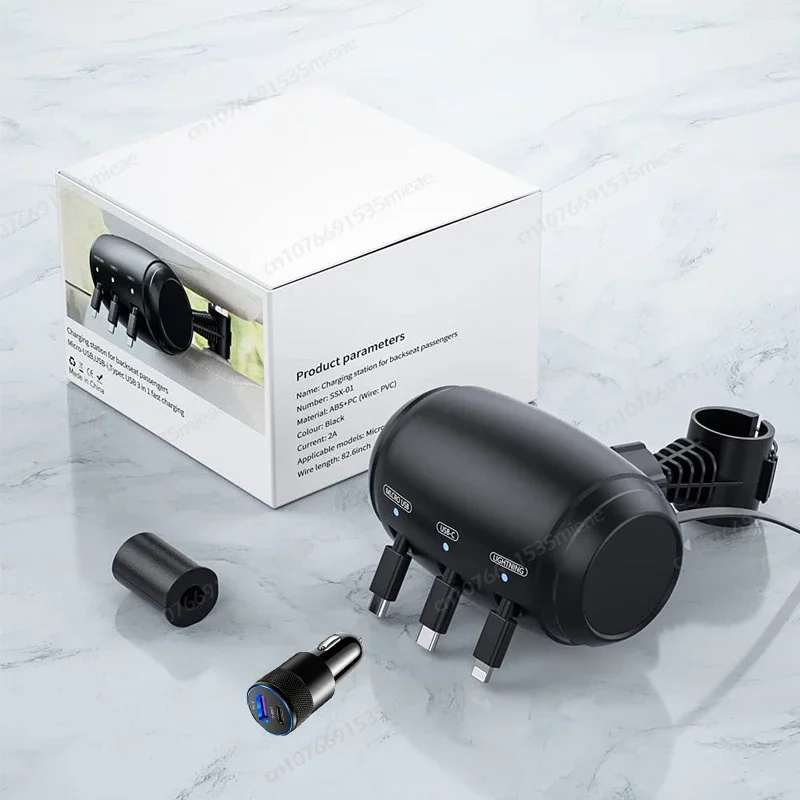 FreedomAutoGear™ 3-in-1 Retractable Car Charging Station for Backseat – 36W Fast Charging Headrest Dock with USB-C, Lightning & Micro-USB Cables